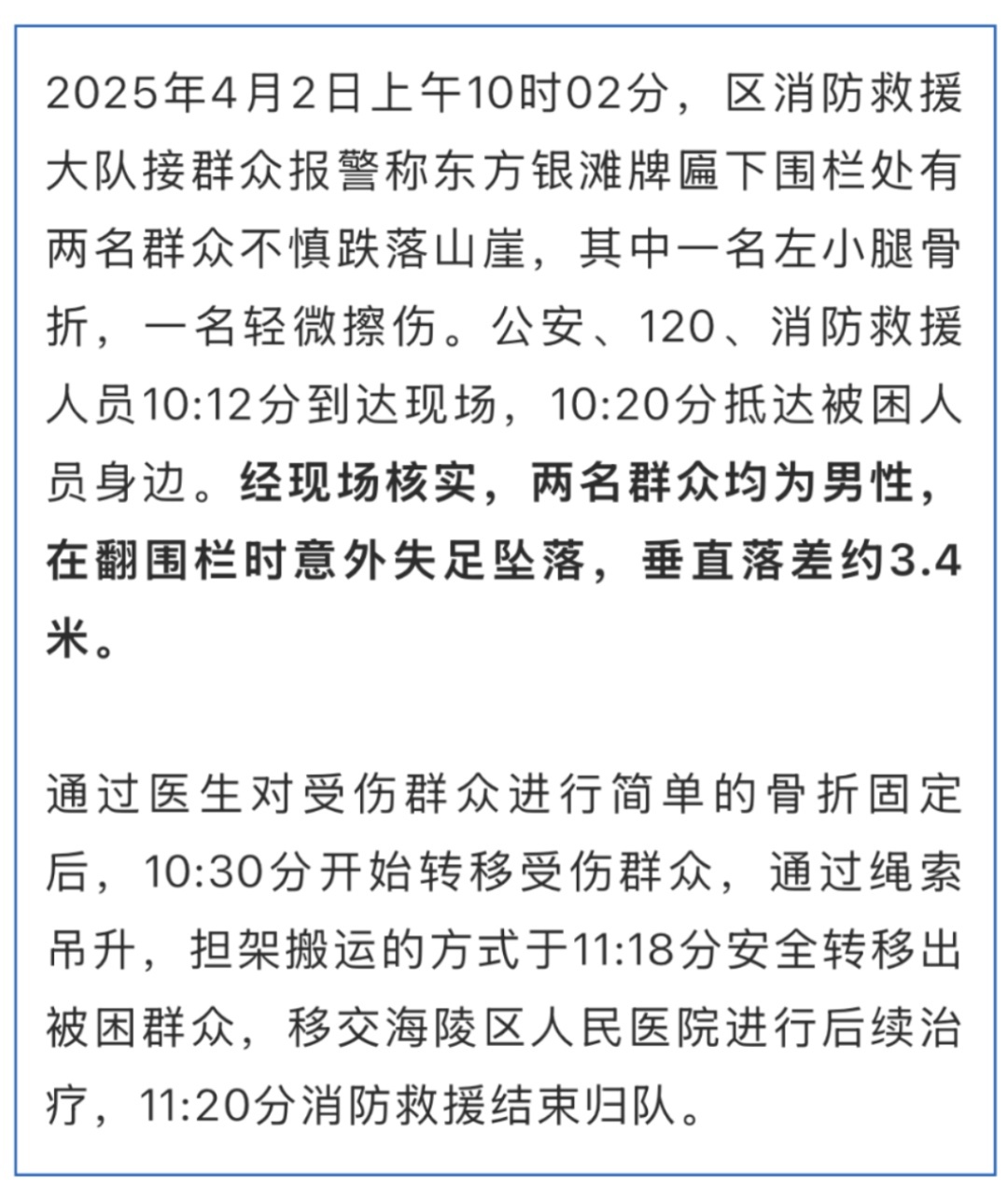 2025年4月2日,广东阳江海陵岛网红观景平台发生意外坠落事件。据了解,2名游客违规擅自进入打卡而失足跌落,其中一人左小腿骨折,一人轻微擦伤。当地官方通报详情如下: