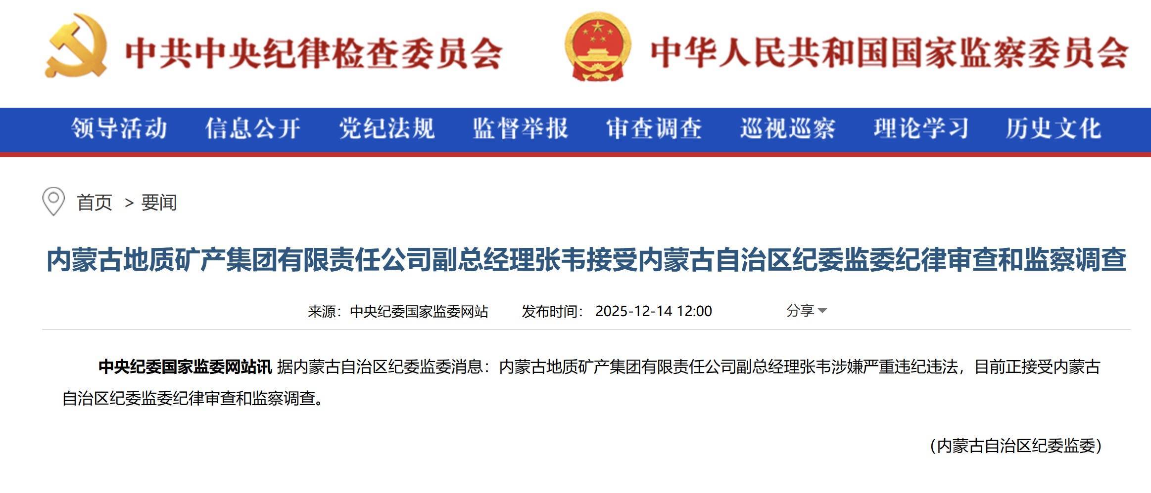 内蒙古地质矿产集团有限责任公司副总经理张韦涉嫌严重违纪违法,目前正接受内蒙古自治区纪委监委纪律审查和监察调查。